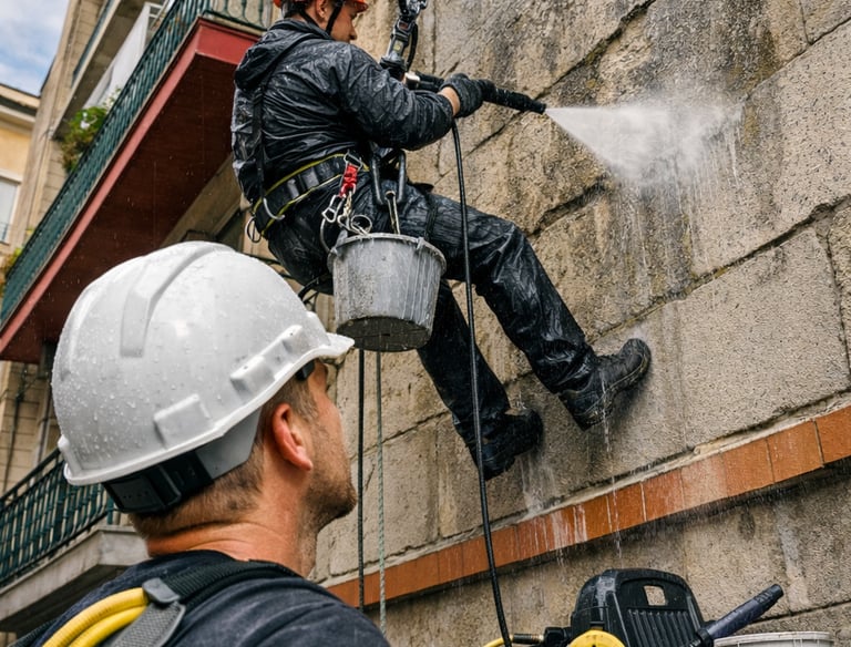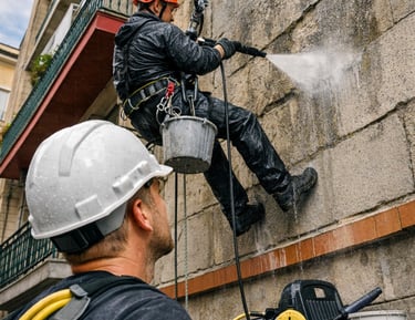 Eliminación de contaminación, moho y manchas mediante limpieza con agua a presión controlada o técnicas manuales.